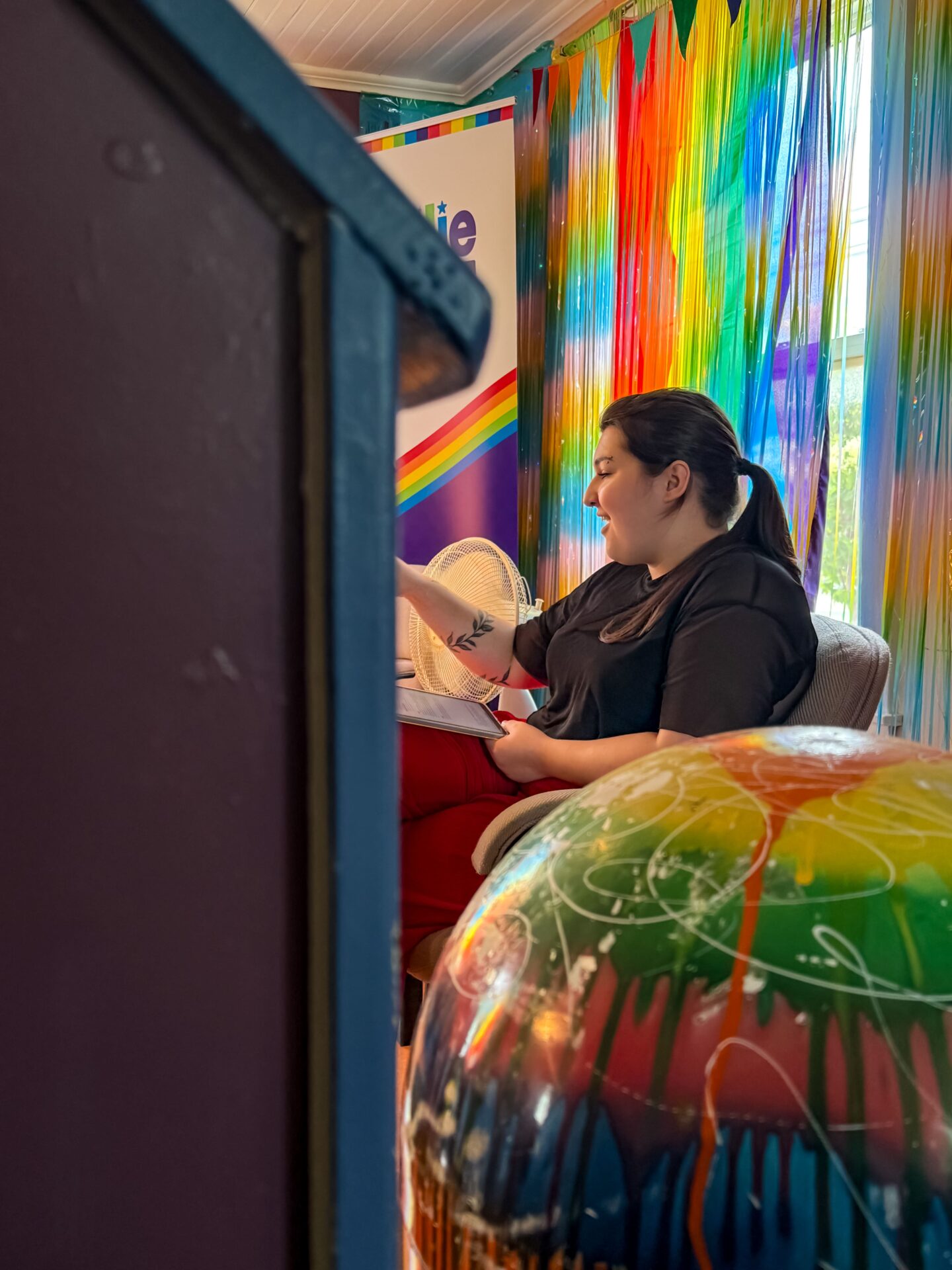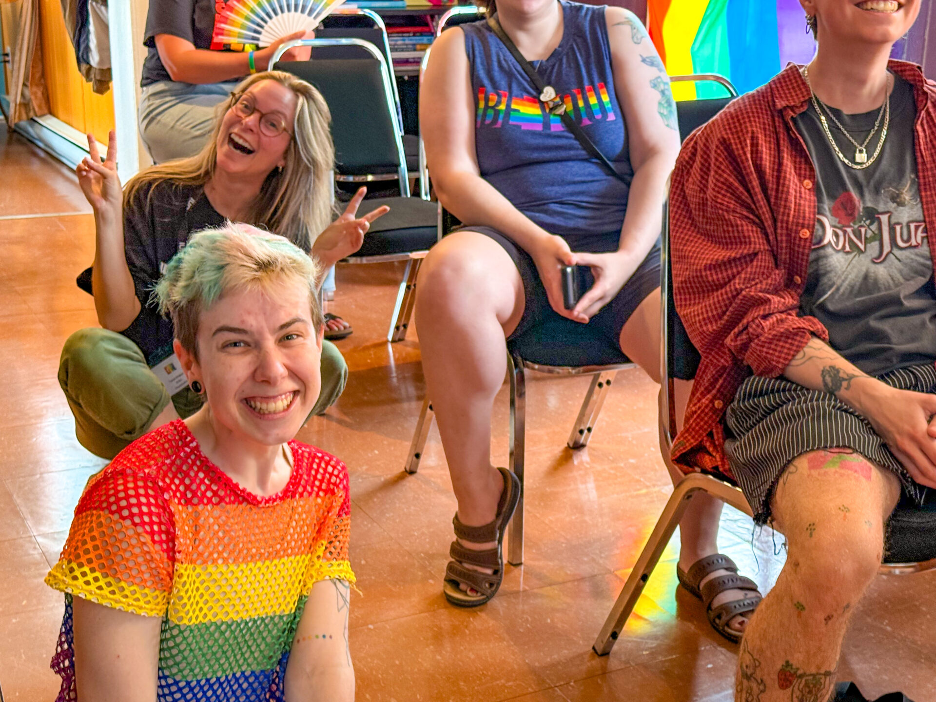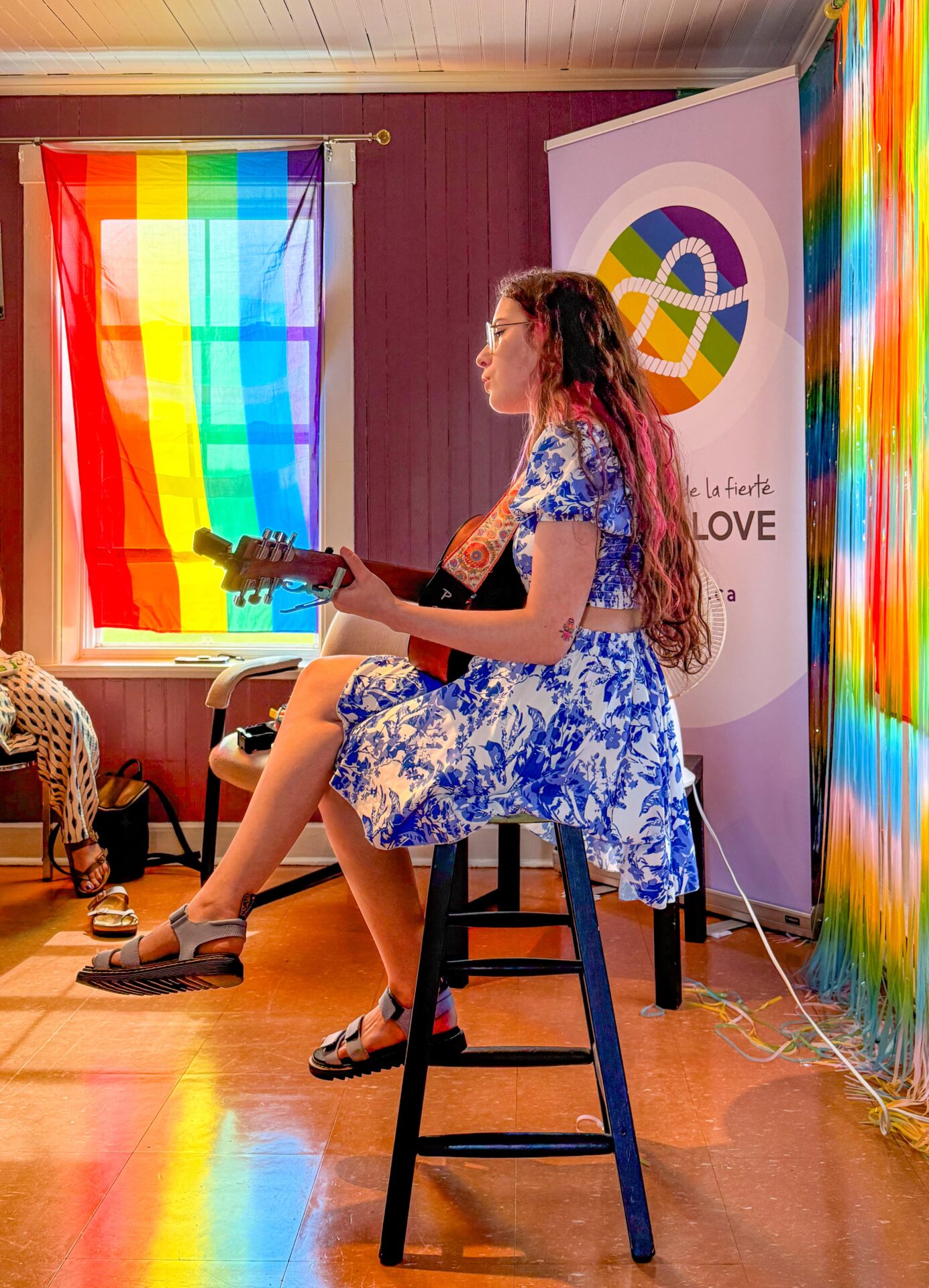 Création spontanée d’un vêtement unique en direct, par l’artiste Janie McLaughlin, inspiré par le drapeau LGBTQ, pour une immersion dans son processus artistique!